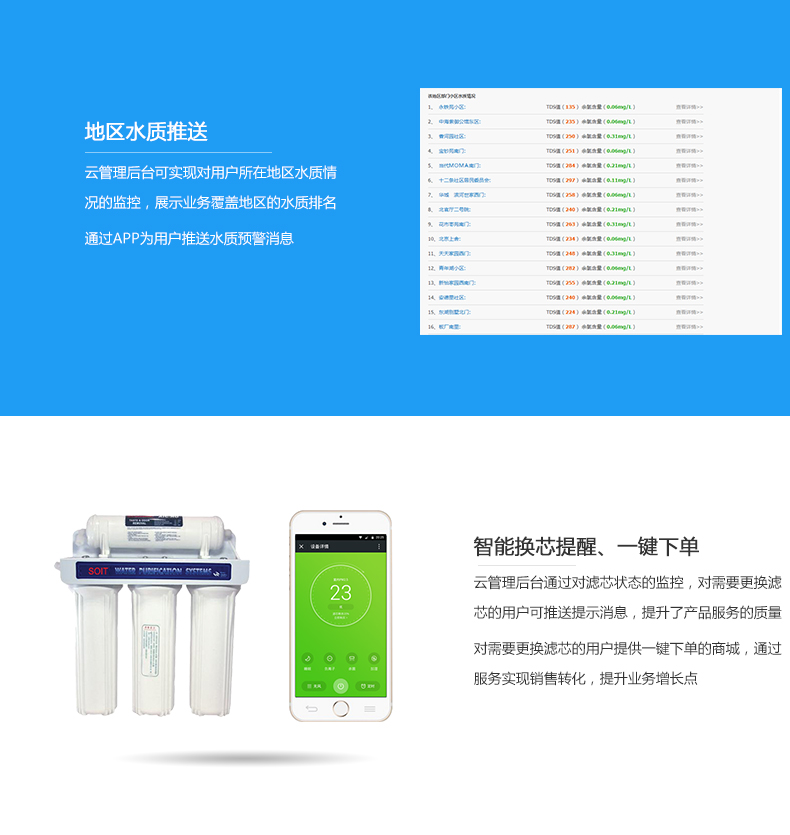 简介—— 智能净水器软硬件开发解决方案 水质变差会给出提醒,用户的饮水健康,一直在认真监护;净水器用户端会统计一天饮用