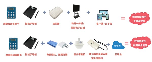 该系统硬件设备由课堂互动答题卡、智能手写板、接收器、全向读写器、投影电子白板、室内考勤机、一体式数据采集终端构成;实现学生课堂答题、考勤、以及学生校园室内外定位等功能;另外还可集成电话卡用于电话沟通、校园消费等功能。